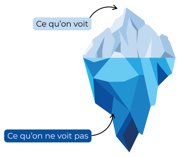 🧊 Il y a la partie visible qui est hors de l’eau (10 %) : les publications, les commentaires, les interactions que tout le monde peut voir.