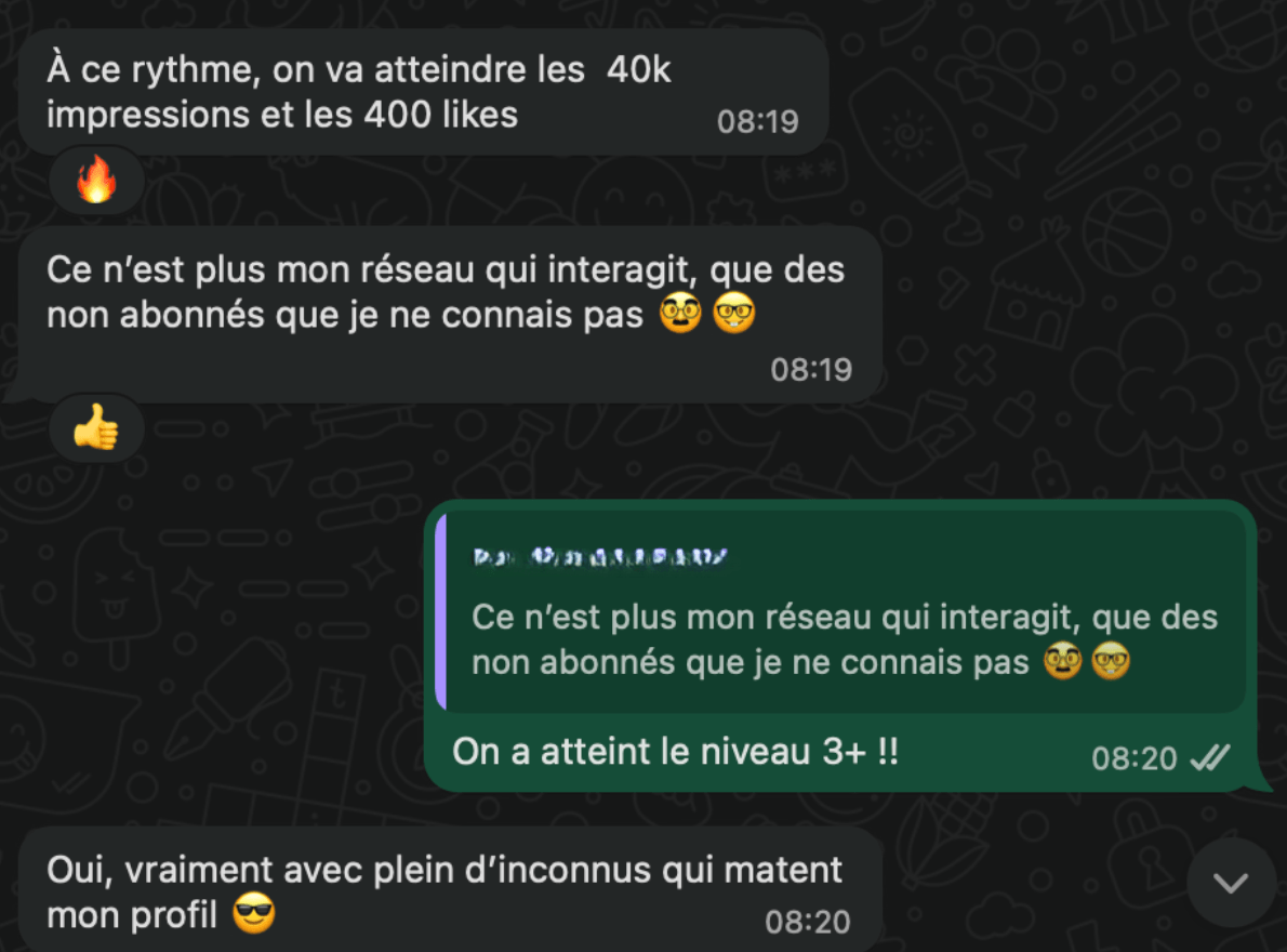Les premiers signaux positifs apparaissent généralement dans les 2-4 premières semaines : amélioration de l'engagement, premières demandes de connexion qualifiées.